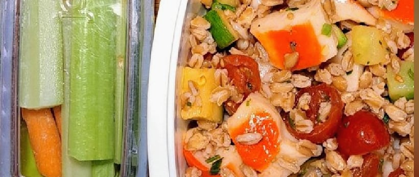 Farro with cherry tomatoes and mozzarella, mixed fish, grilled veggies, and chicken