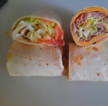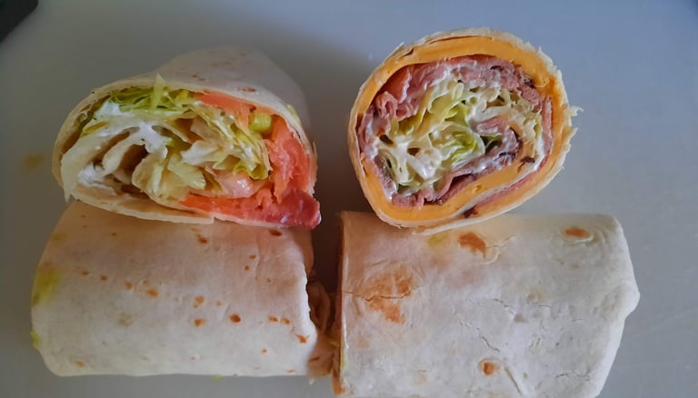 3. Roast Beef & Cheese Wrap Place sliced cheese (cheddar, mozzarella, gouda) on the tortilla. Add the dressed salad and a touch of mustard or horseradish. Caramelized onions are a great addition if you enjoy them. Roll tightly and wrap in foil.